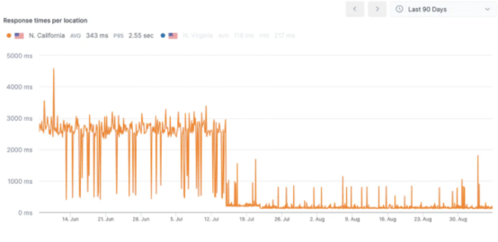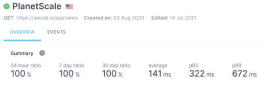 - 10秒内部署:我在测试13个数据库后,发现PlanetScale部署速度最快。使用它几周并监控性能后,我看到API平均在大约150ms内解析(见下面的结果)。