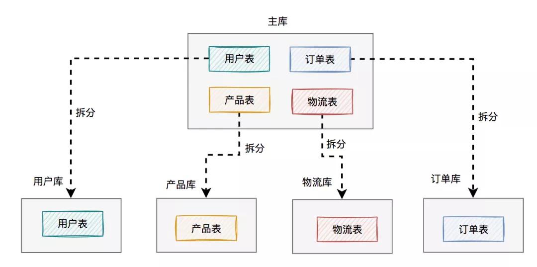 将用户、产品、物流、订单相关的表,从原来一个数据库中,拆分成单独的用户库、产品库、物流库和订单库,一共四个数据库。
