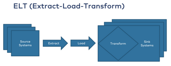 提取-加载-转换(ELT)是一种非常相似的方法。但是,转换和聚合发生在摄取到数据存储区域之后: