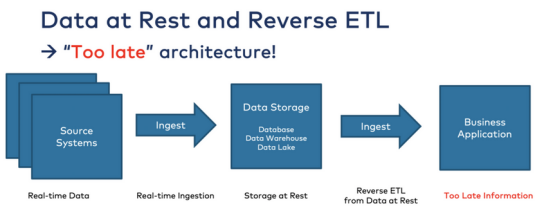 如果将数据存储在数据仓库或数据湖中,则无法再实时处理它,因为它已经处于静止状态。这些数据存储是为索引、搜索、批处理、报告、模型训练和其他在存储系统中有意义的用例而构建的。但是不能从静态存储中实时消耗动态数据: