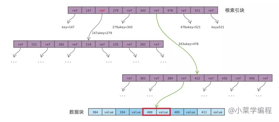 紫色部分数据块为索引,它将索引键的范围划分为多个区间;每个区间保存着另一个数据块的地址( ref ),表示该范围内的数据,可以通过 ref 指向的数据块找到。上图中红色的 ref 表示, 之间的数据,可以通过其左下方的另一个索引数据块找到。