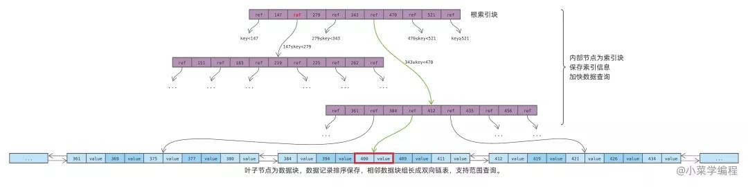 从树的根节点索引块出发,根据数据键所在范围的 ref 逐层往下找,即可定位到数据记录。举个例子,当查询键为 400 的记录时,搜索路径如绿色箭头线所示: