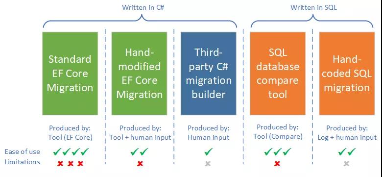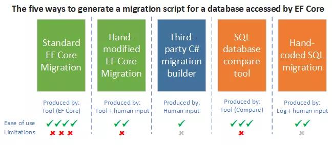 下面的列表提供了将迁移应用于数据库的不同方法。我列出了EF Core案例的三个选项:第一个是最简单的,但是它有其他两个选项所没有的限制。SQL迁移没有实际限制,但确实需要数据库迁移应用程序工具才能以正确的顺序应用SQL脚本。