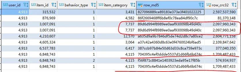 - crc32(concat(user_id, item_id, behavior_type, item_category)) as row_crc32
