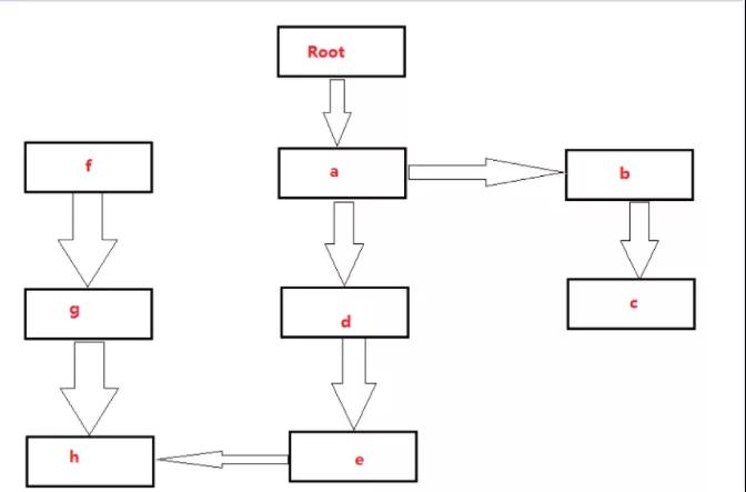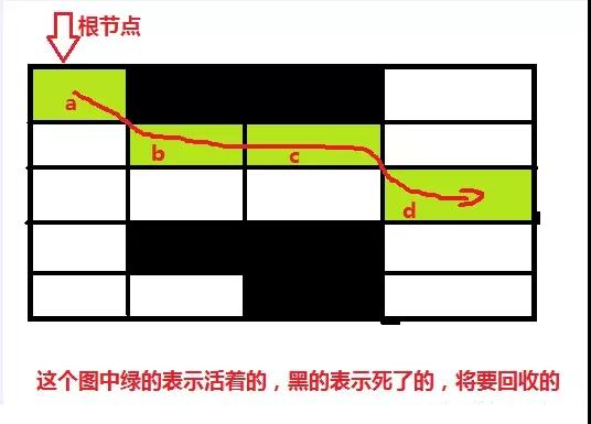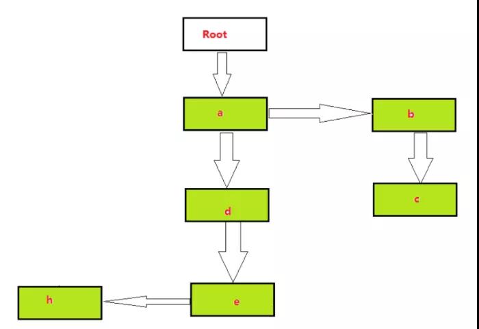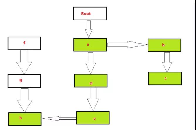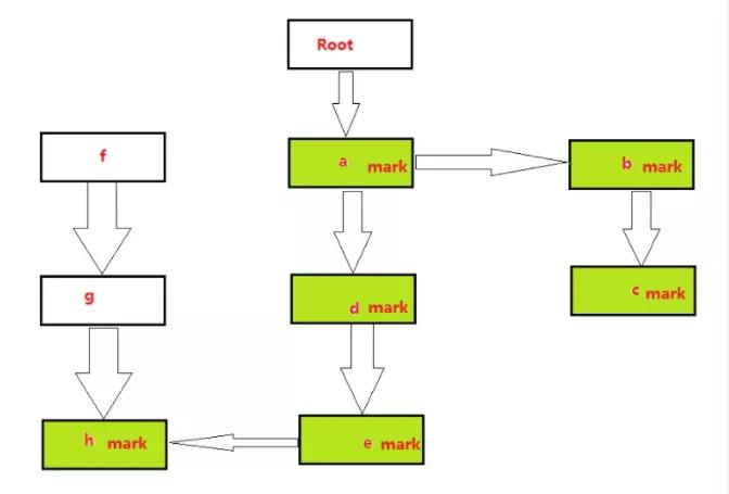 按照根节点开始遍历 标记的abcdeh都是存活的对象,接下来开始标记。