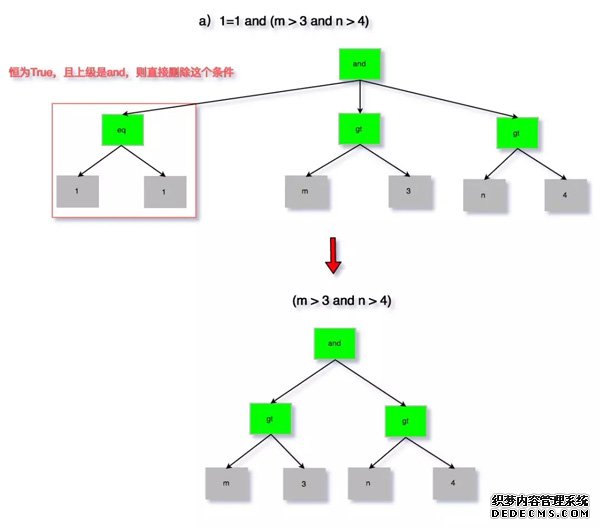 无用条件去除属于优化器的逻辑优化范畴,可以仅仅根据SQL本身以及表结构即可完成,其优化的情况也是较多的,代码在sql/sql_optimizer.cc文件中的remove_eq_conds函数。为了避免过于繁琐的描述,以及大段代码的粘贴,这里通过图来分析以下四种情况:
