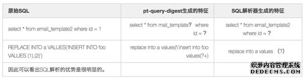 - 生成SQL特征。将SQL语句中的值替换成问号,方便SQL归类。虽然可以使用正则表达式实现相同的功能,但是其Bug较多,可以参考pt-query-digest。比如pt-query-digest中,会把遇到的数字都替换成“?”,导致无法区别不同数字后缀的表。