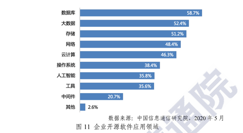 根据信通院的数据,我国超半数企业使用开源软件应用于数据库方向。企业在数据库方面对开源软件的使用比例最高,占比为58.7%,其次企业对大数据和存储的开源软件使用占比也均超过五成,分别为52.4%和51.2%。