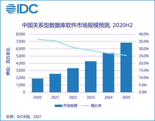 北京,2021年8月17日——根据IDC《2020年下半年中国关系型数据库软件市场数据跟踪报告》显示,2020年全年中国关系型数据库软件市场规模为18.8亿美元,同比增长36.5%。总体来看,疫情对2020年中国关系型数据库市场的增长影响较小。2020年初期,疫情对传统部署模式的关系型数据库交付产生了一定的影响,但在年中疫情平稳后得到快速恢复。IDC预测,到2025年,中国关系型数据库软件市场规模将达到68.5亿美元,未来5年整体市场年复合增长率(CAGR)为29.5%。