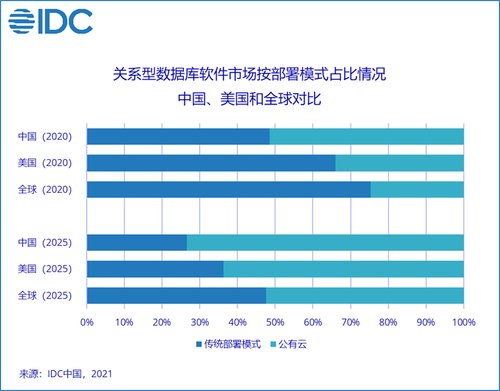 从部署模式来看,中国公有云模式的关系型数据库占比明显要高于同期的美国和全球市场。2020年,公有云模式的关系型数据库软件占比达到51.5%,首次超过传统部署模式市场规模,预计未来公有云模式的份额将继续提高,到2025年将达到73.5%。