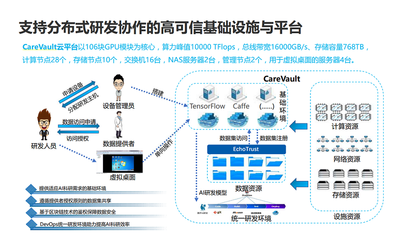 二、基于区块链技术的鉴权保障数据安全:CareVault 云平台基于区块链技术,构建了医院、高校、研究机构和技术赋能企业之间的可信体系,实现生态链上各方的医疗数据高效、快速、隐私和安全地共享流转与应用。
