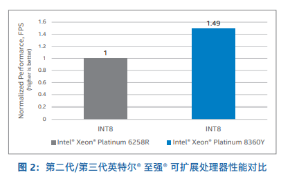 从图二中,将第二代英特尔®至强®可扩展处理器与第三代进行了对比测试,在同样将 FP32 转换成 INT8 的场景下,第三代英特尔®至强®可扩展处理平台能够将推理速度(吞吐量,FPS) 提升 49%: