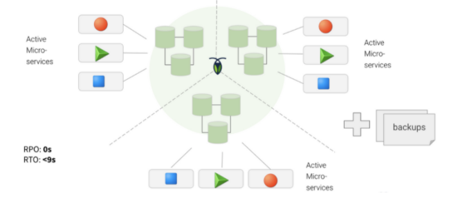在这个模式中,集群中的所有节点,都可以同时进行读写操作。由于在多个活动的集群中,所有节点都是平等的,因此它们没有了所谓主节点和被节点的概念。据此,您不但拥有可控的HA和DR功能,而且还具有可以轻松扩展的固有能力。目前,可以被部署为此类模式的数据库包括:CockroachDB、Cassandra以及Couchbase。