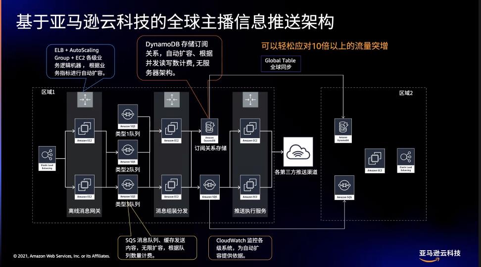 开播服务有几大特点,业务变化非常快,低峰与高峰的数值跃动大,预测和预留资源困难,订阅关系分布不均匀,实时性比较高。因此,在亚马逊云科技的帮助下,虎牙设计了全球主播信息推送架构,可以轻松应对10倍以上的流量突增。