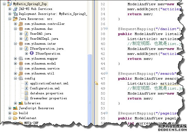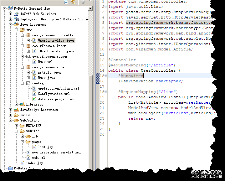 当然,你也可以按一般程序的思路,创建一个service 的package, 用service 去调用 dao层,我这里就没有做了,因为比较简单,用类似的方法,也机注意自动注入时,也要配置 <context:component-scan base-package="com.yihaomen.service" /> 等这样的。