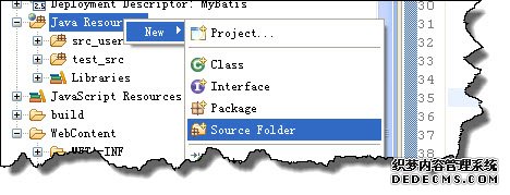 1. 在MyBatis 里面创建两个源码目录,分别为 src_user,test_src, 用如下方式建立,鼠标右键点击 JavaResource.