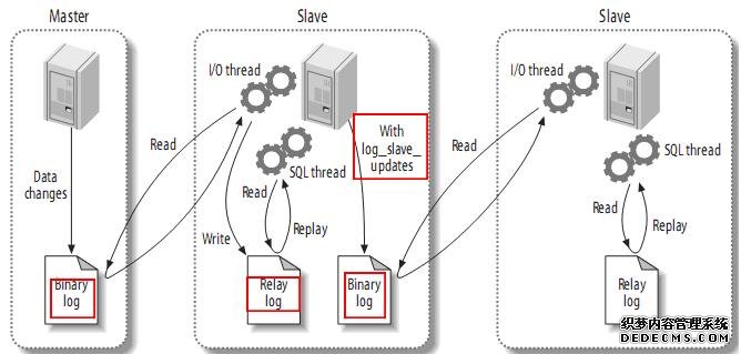 当设置log_slave_updates时,你可以让slave扮演其它slave的master。此时,slave把SQL线程执行的事件写进行自己的二进制日志(binary log),然后,它的slave可以获取这些事件并执行它。如下: