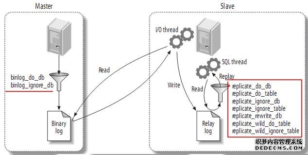 复制过滤可以让你只复制服务器中的一部分数据,有两种复制过滤:在master上过滤二进制日志中的事件;在slave上过滤中继日志中的事件。如下: