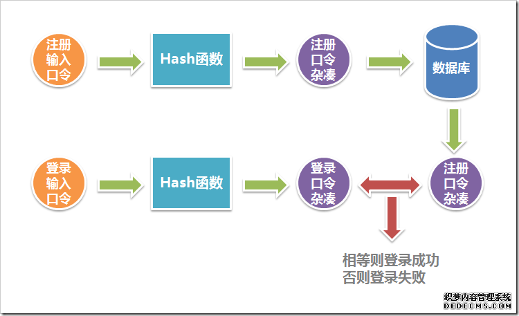 如上图,对注册进来的口令进行哈希算法的映射,将得到的杂凑字符串存入数据库;对每次登录的口令进行哈希算法的映射,将得到的杂凑字符串和数据库里的注册口令杂凑字符串比较,有相同的,则登录成功。