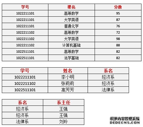 表3- 每一名学生的学号、姓名、系名、系主任这些数据重复多次。每个系与对应的系主任的数据也重复多次——数据冗余过大