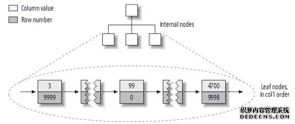 注:MyISAM不支持聚簇索引,索引中每一个叶子节点仅仅包含行号(row number),且叶子节点按照col1的顺序存储。