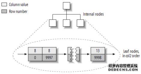 注:叶子页面包含完整的元组,而内节点页面仅包含索引的列(索引的列为整型)。一些DBMS允许用户指定聚簇索引,但是MySQL的存储引擎到目前为止都不支持。InnoDB对主键建立聚簇索引。如果你不指定主键,InnoDB会用一个具有唯一且非空值的索引来代替。如果不存在这样的索引,InnoDB会定义一个隐藏的主键,然后对其建立聚簇索引。一般来说,DBMS都会以聚簇索引的形式来存储实际的数据,它是其它二级索引的基础。