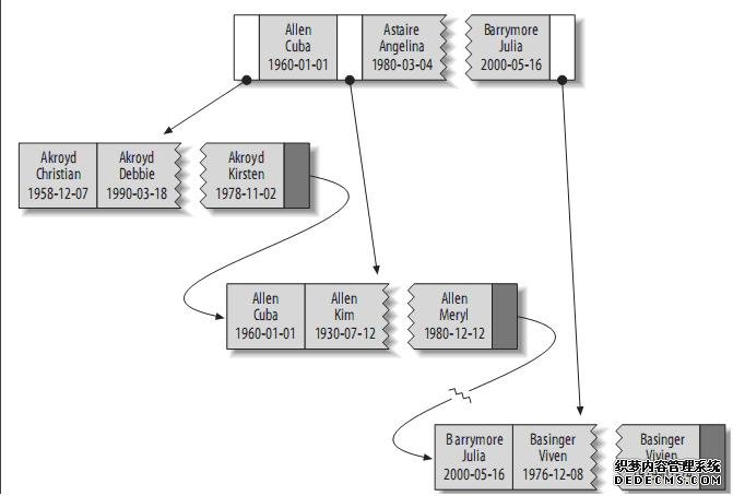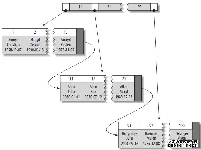 (4)匹配值的范围查询(Match a range of values):可以利用索引查找last name在Allen和Barrymore之间的人,仅仅使用索引中第1列。
