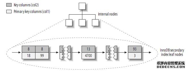 注:聚簇索引中的每个叶子节点包含primary key的值,事务ID和回滚指针(rollback pointer)——用于事务和MVCC,和余下的列(如col2)。