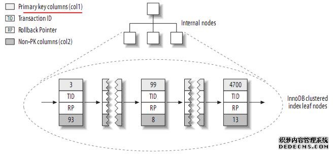 注:聚簇索引中的每个叶子节点包含primary key的值,事务ID和回滚指针(rollback pointer)——用于事务和MVCC,和余下的列(如col2)。