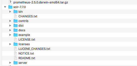解压之后,目录结构如下图,bin里边提供部署的文件,contrib提供额外的jar包,docs提供solr的一些文件,server提供solr服务