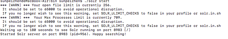 启动方式1. 终端进入bin目录下,执行命令 : ./solr start ,启动结果如下图,可见,solr已启动