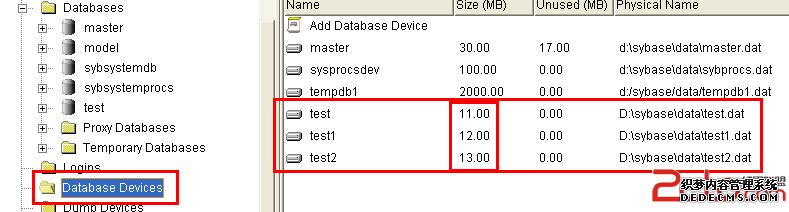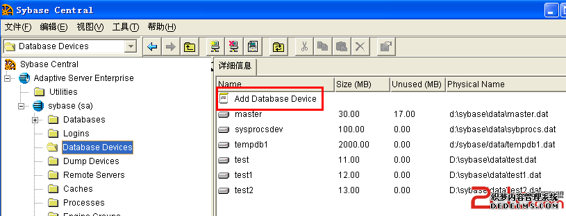 登录成功后,点击Database Devices ,创建与原数据库一样的Database Devices,创建过程比较简单,这里就不详细给出了。但是创建过程中注意文件大小、Devices number、文件所在位置的设置(与原数据库一致)。