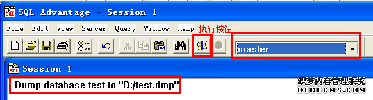 连接成功后,选择master数据库,在Session1中输入如下命令:Dump database Test to "D:/Test.dmp"(将数据库test备份到D:/Test.dmp文件中)。点击执行按钮。