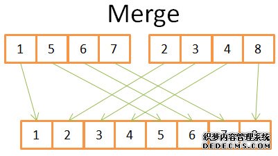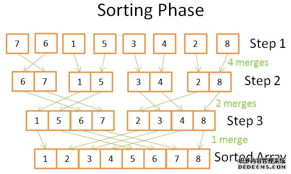 通过此图你可以看到,在 2 个 4元素序列里你只需要迭代一次,就能构建最终的8元素已排序序列,因为两个4元素序列已经排好序了: