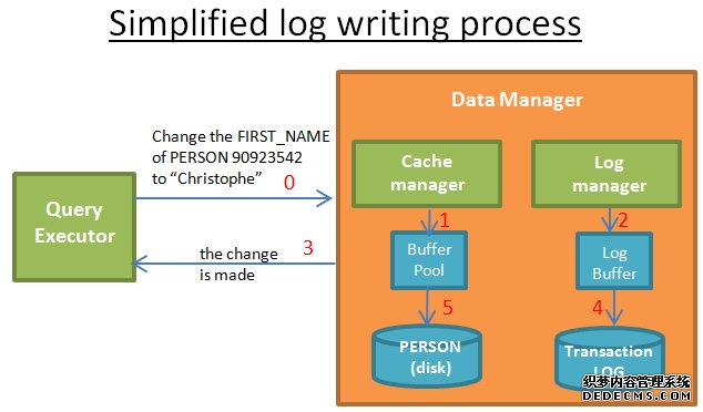 这个工作由日志管理器完成。简单的理解就是,日志管理器处于缓存管理器(cache manager)和数据访问管理器(data access manager,负责把数据写入磁盘)之间,每个 update / delete / create / commit / rollback 操作在写入磁盘之前先写入事务日志。简单,对吧?