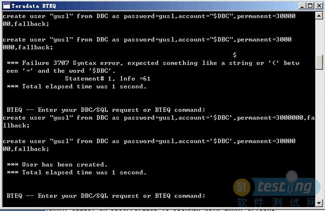 创建用户命令: create user "gusl" from DBC as password=gusl,account='$DBC',permanent=3000000,fallback;