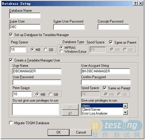 (3)在开始菜单的Teradata选项中选择“Database Setup”用来创建数据库和用户。弹出如图2的窗口,输入数据库的名称gusl和对应的Super user的用户名和密码,同时创建一个管理用户,密码设置什么的都在这。