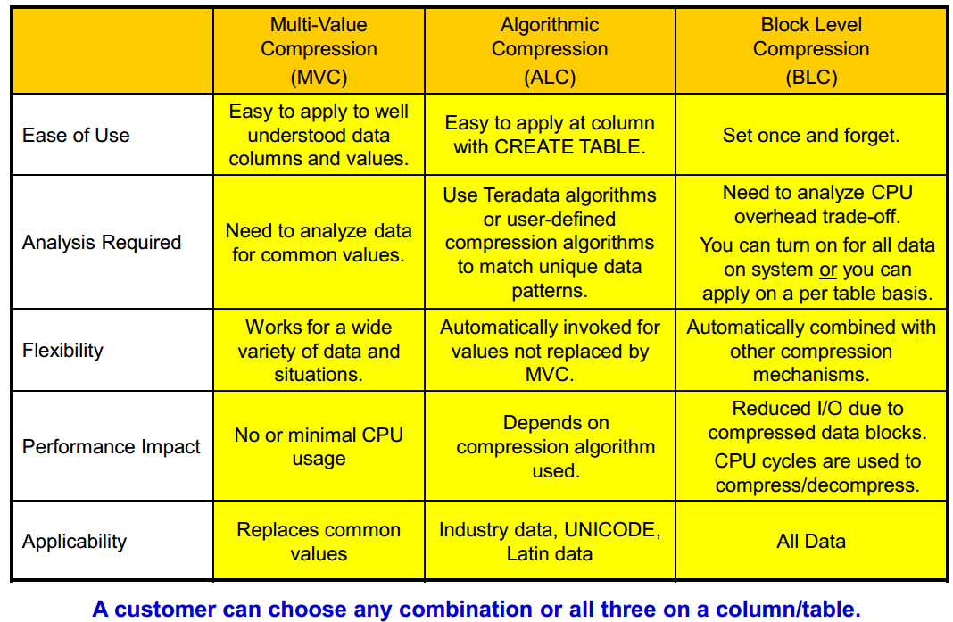 Block Level Compression :在数据块实际写入/读取存储设备之前,Teradata在文件系统级别对整个数据块执行压缩。
