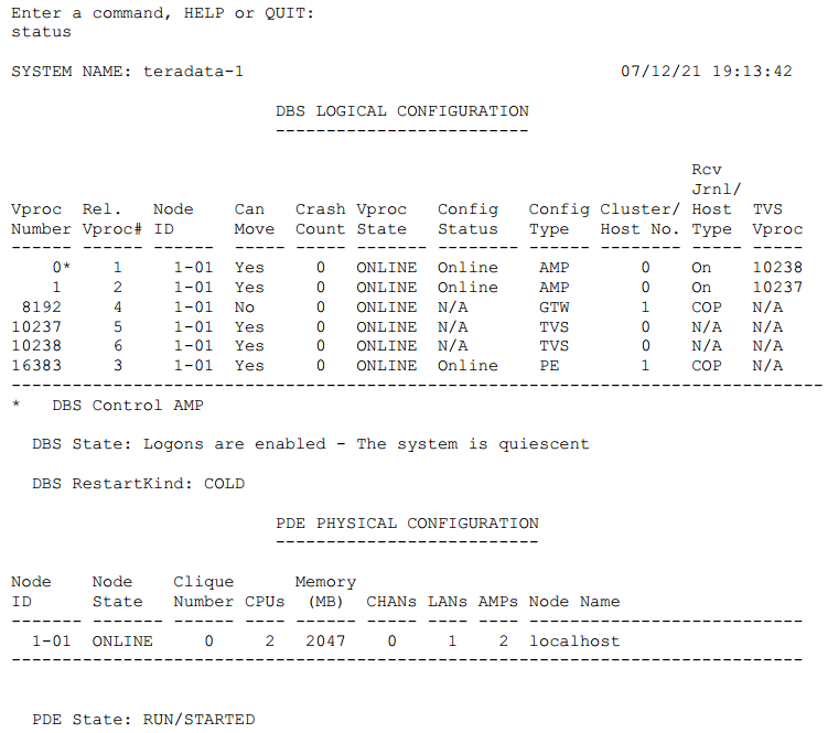 【status | status dbs | status online | status notonline | status pde | status restart | status sysstate | status 0,1,2,3 to 10,8192 to 20000】
